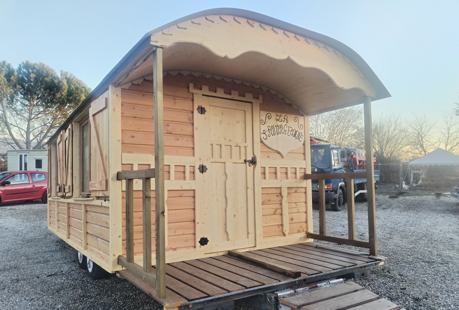 Chaque modèle est orné d’un écusson unique et porte un nom qui raconte son histoire, faisant de votre roulotte bien plus qu’un simple habitat : une véritable œuvre d’art sur roues.